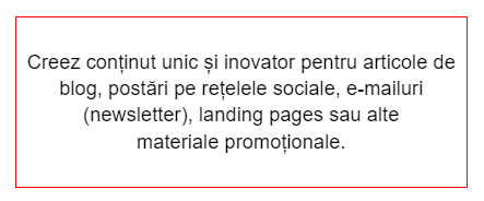 Misiunea mea este să scriu texte clare și ușor de înțeles. Texte ce atrag și rețin atenția publicului țintă, pe care l-am studiat aprofundat pentru că…